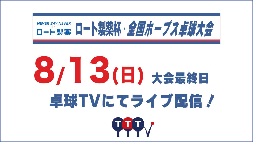 日本卓球協会は8月11日(金)から13日(日)にかけて東京都の東京体育館にて開催する『ロート製薬杯・第41回全国ホープス卓球大会』の最終日に、準々決勝戦以降の模様を『卓球TV』にてライブ配信する。