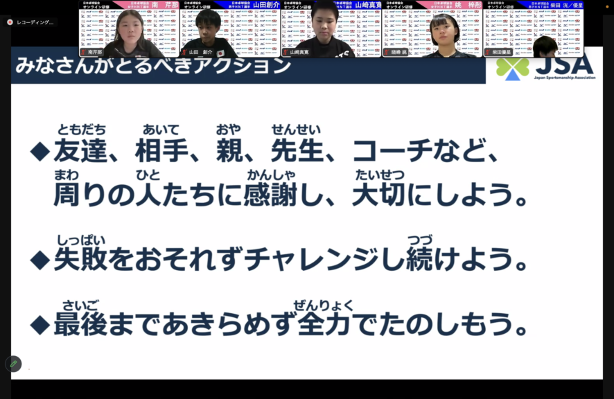 日本卓球協会強化本部はHNT(ホープスナショナルチーム)に所属する男女選手に向けたオンライン研修合宿を3月10日(日)に実施いたしました。今年度最後となるオンラインで実施する研修合宿では、「スポーツマンとはどんな人?」「優れた選手とは?」という視点で、目指すべき選手像や考え方を学ぶことができた。クイズ形式での講師の方からの問いかけに対し、選手たちがしっかり考えながら積極的に発言していた。