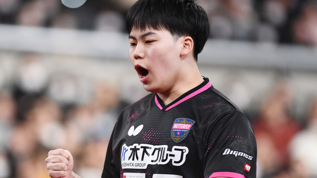準決勝で優勝候補だった張本智和(智和企画・宮城)を退けて決勝に進んだ松島は、その勢いのまま3ゲームを連取。第4ゲームはパリ五輪代表の篠塚が盛り返し、打ち合う展開を制してゲームカウントを1-3とする。