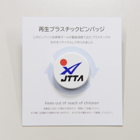 このたび日本卓球協会は、ニッタク(日本卓球株式会社)様のご協力を得て、ボールの製造過程で捨てられていた欠片をリサイクルしたピンバッジを作製致しました。