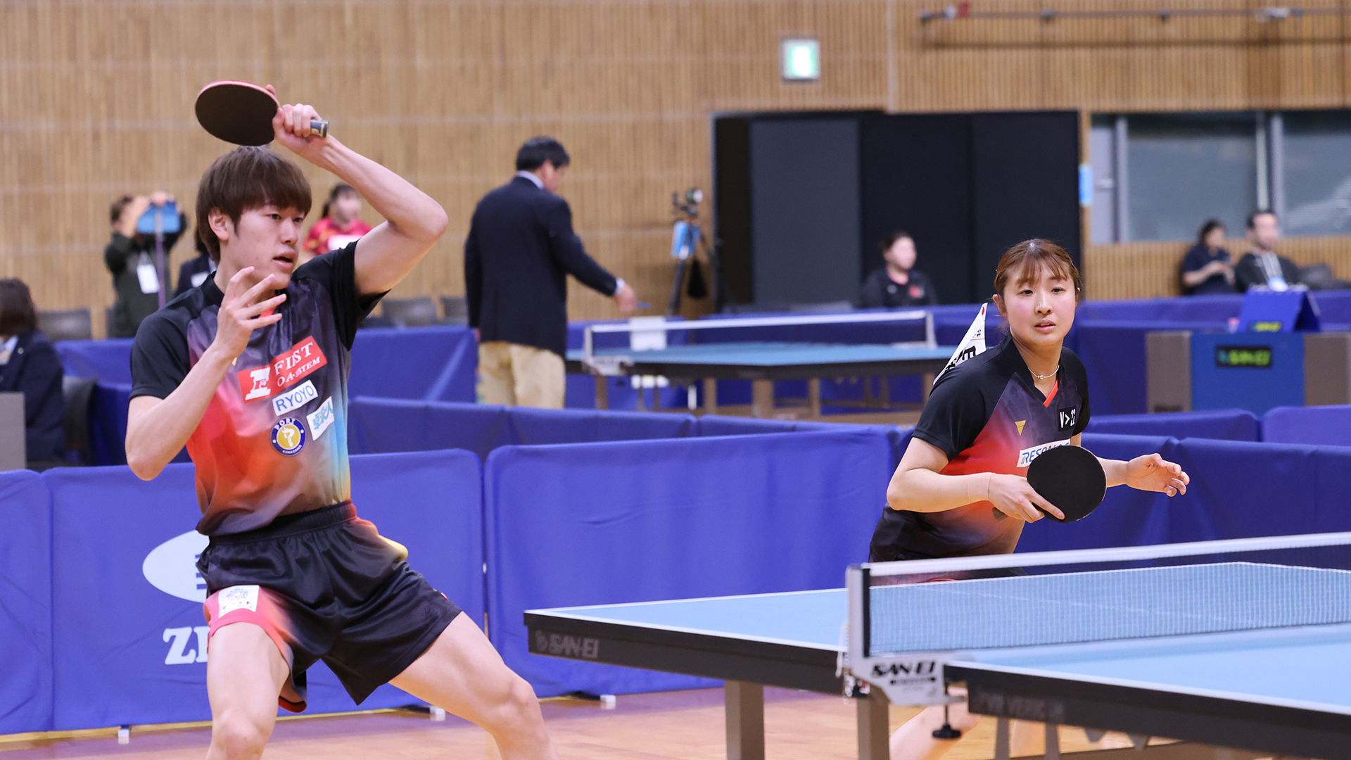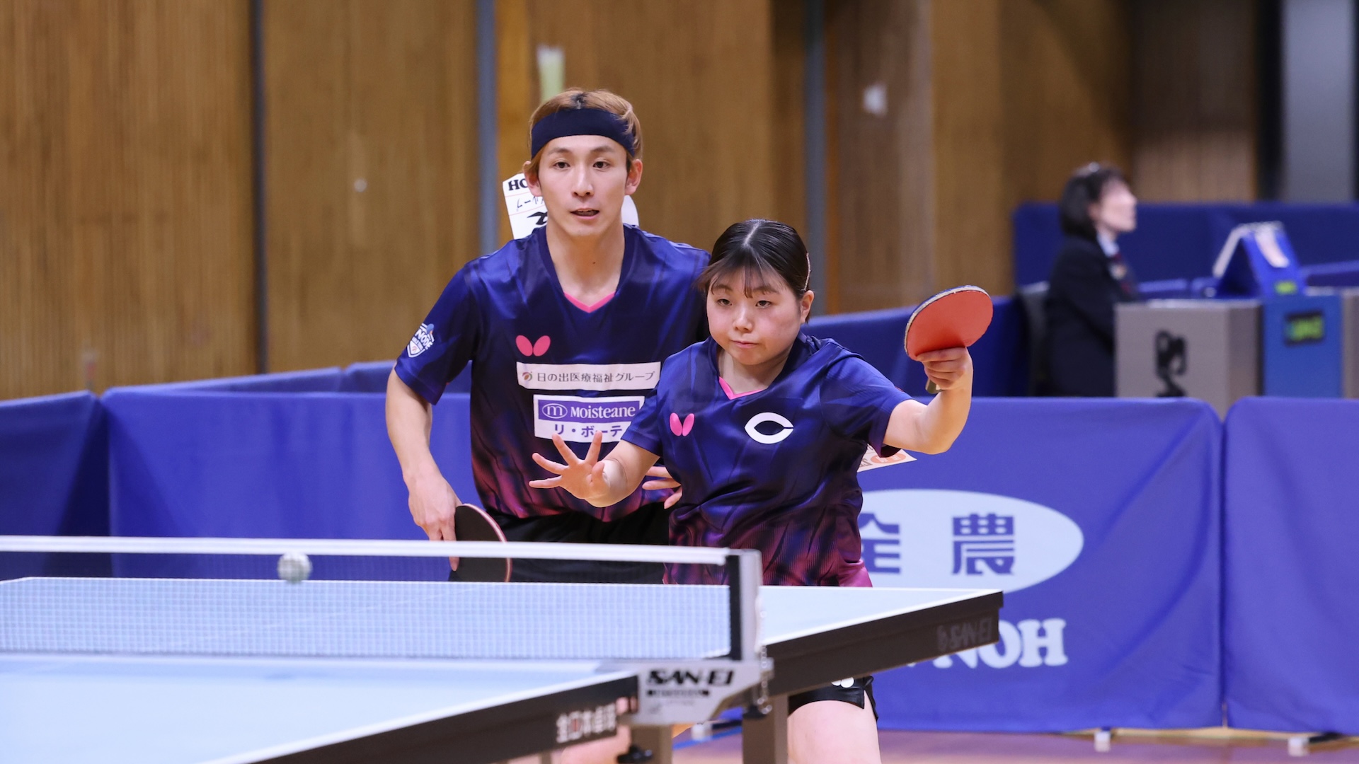佐藤卓斗・直江杏組(法政大、筑波大)に1ゲームを奪われるも、冷静な戦いぶりで勝ち上がってきた松島輝空・張本美和組(木下グループ)は大貫蓮弥・加藤心乙花組(希望が丘高)と対戦する。今年の全日本選手権一般の部の優勝者同士のペアである松島・張本組の活躍に注目したい。
