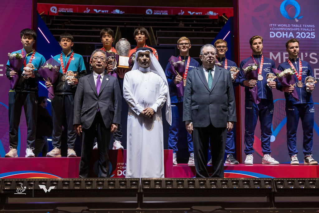2025年WTTCF ドーハ大会 男子ダブルス表彰式にてプレゼンターを務めた前原氏(前列一番左)