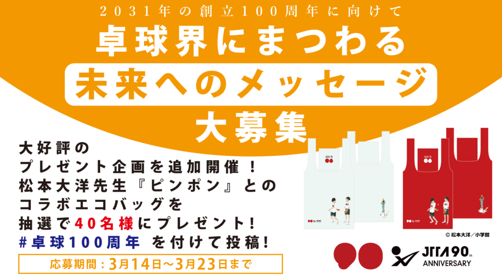 - キャンペーン名称:日本卓球協会90周年記念「100周年の卓球界に向けたメッセージ」大募集!抽選で松本大洋先生「ピンポン」コラボエコバッグプレゼント!