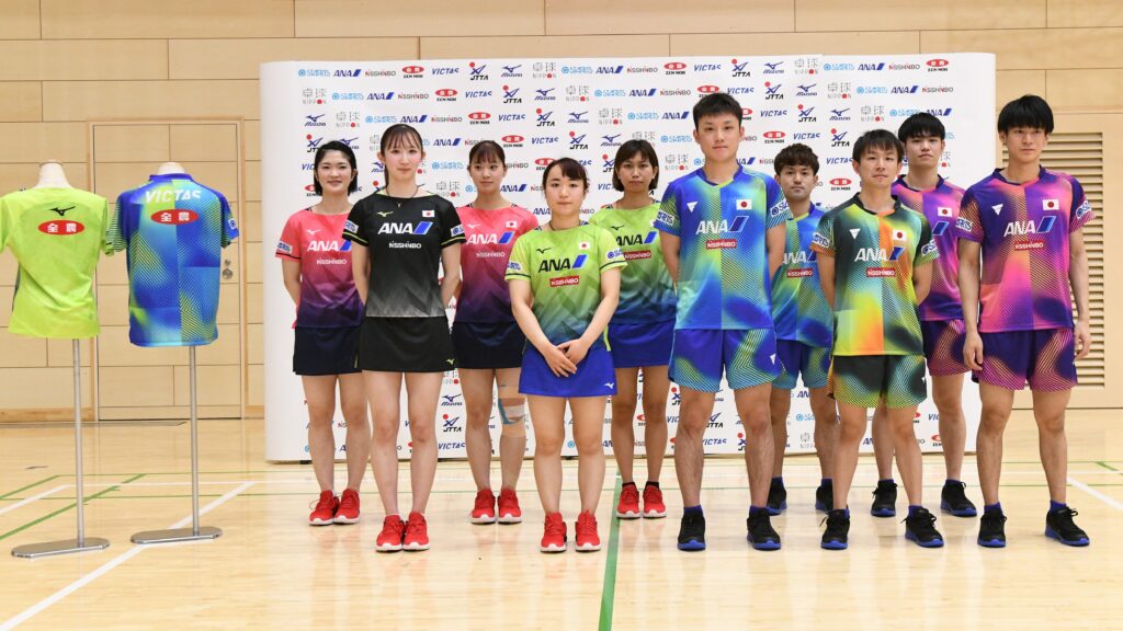 2022年9月に中国で開催予定の世界卓球選手権大会の卓球日本代表メンバーが記者会見に出席。JTTAオフィシャルサプライヤーの株式会社VICTAS(男子)、ミズノ株式会社(女子)から提供された2022年度の新ウエアを選手たちは着用しました。
