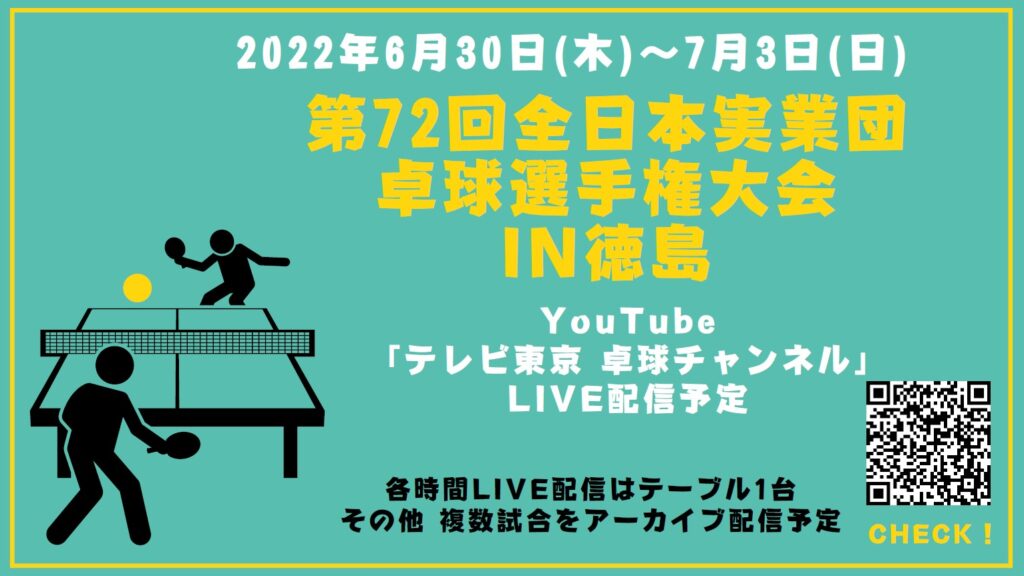 大会・試合 2022.06.14 全日本実業団卓球選手権大会 ライブ配信(一部の試合)実施 2022年6月30日(木)から徳島県アミノバリューホール(鳴門県民体育館)で開催される第72回全日本実業団卓球選手権大会において、一部の試合をYou Tube「テレビ東京 卓球チャンネル」でライブ配信することになりました。 大会期間中、ライブ配信は1コート、その他複数の試合のアーカイブ配信を予定しています。 大会情報ページ → こちら 前の記事へ 新しい記事へ