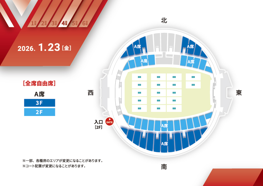- 4.アリーナ席を除くお席での飲食は可能ですが、その際はまわりの他のお客様へのご配慮をいただきますようお願いいたします。