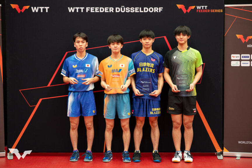 男子ダブルス 優勝:野田颯太(写真中央右)・面田知己(写真右端)ペア、準優勝:濵田一輝(写真左橋)・徳田幹太(写真中央左)ペア
