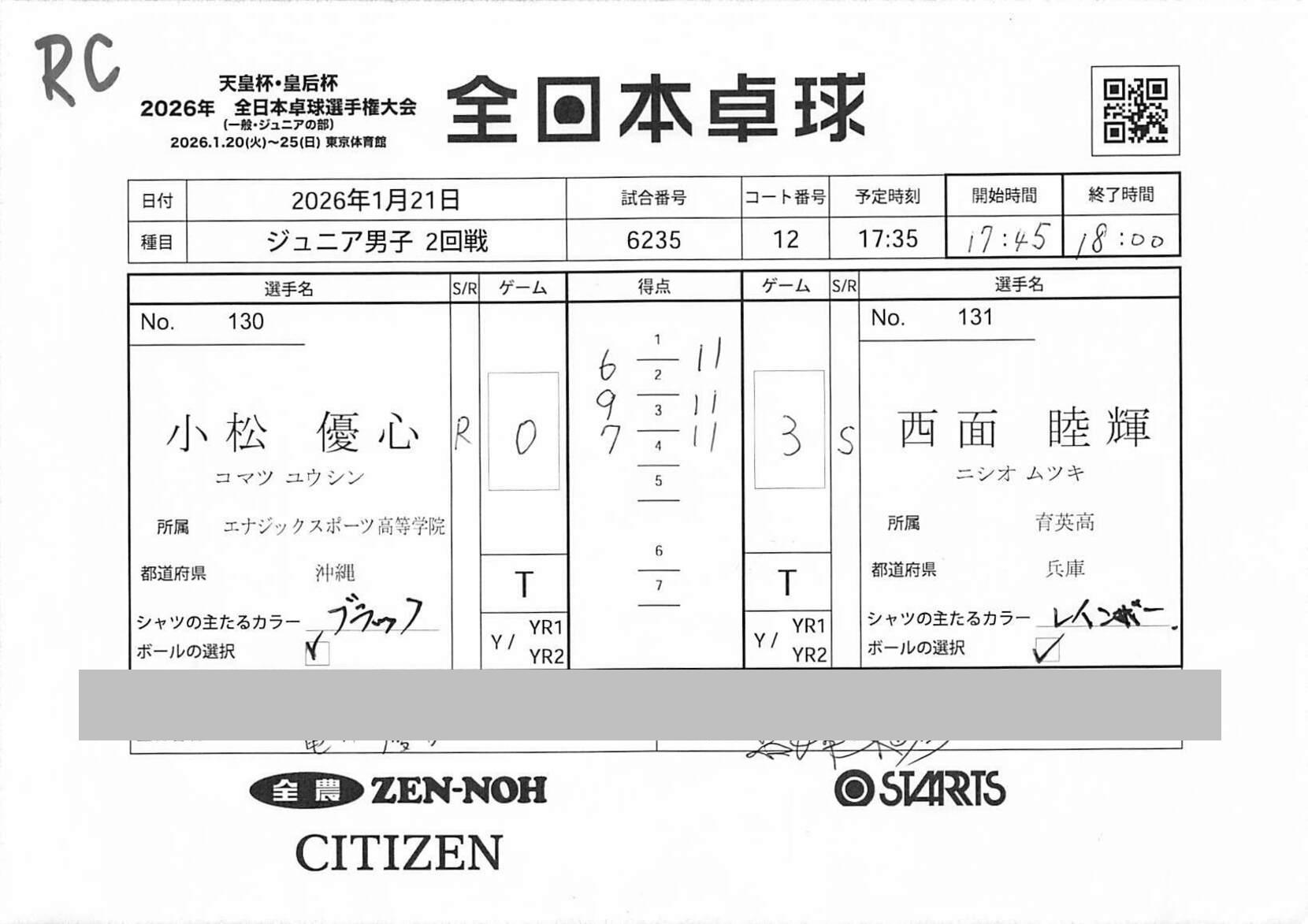1回戦 | 試合ID : 6156 |