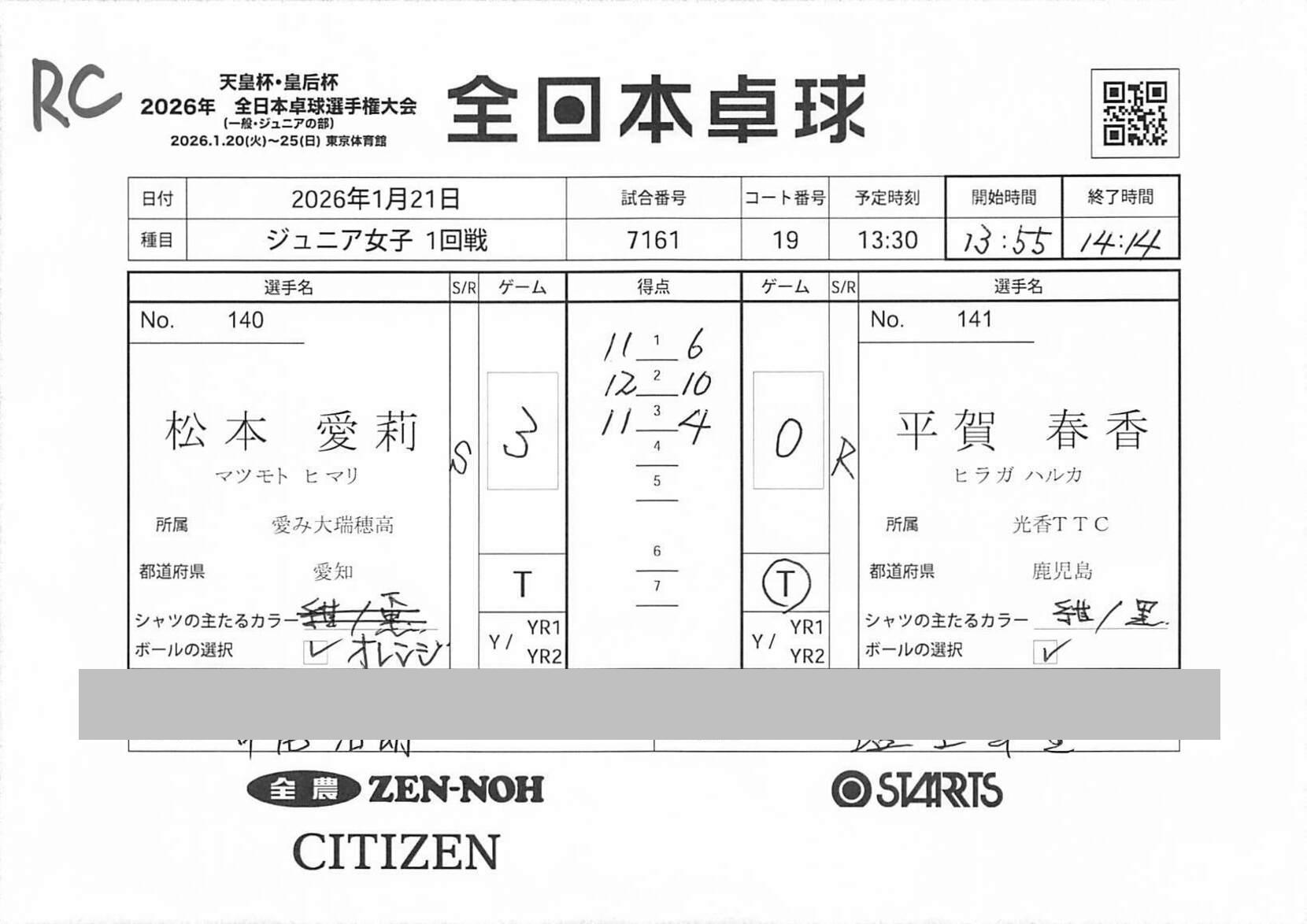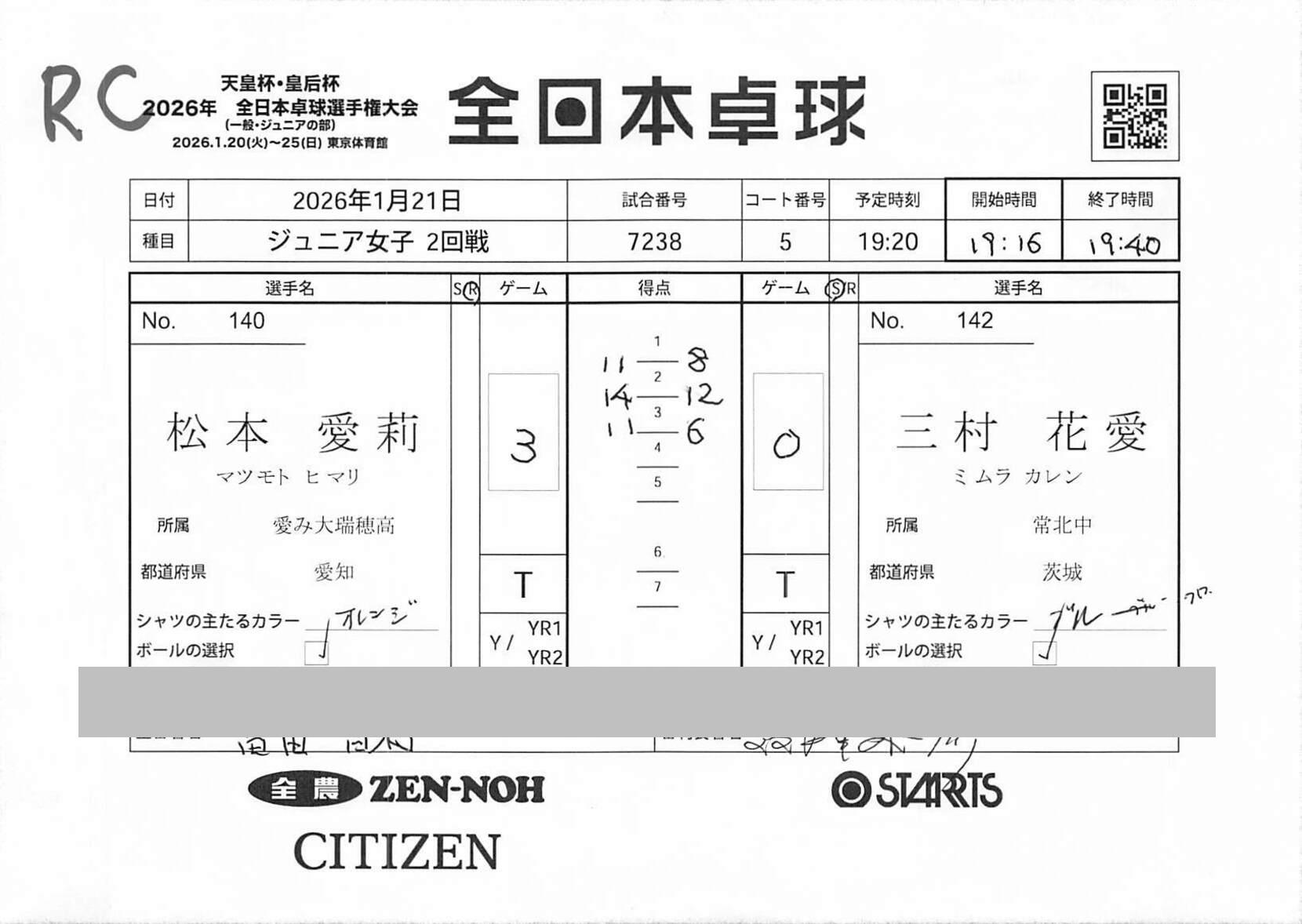 | 原 七星【卓桜会栃木卓球センター(栃木)】 | 5 | 11 | 9 | 11 | 1 | |